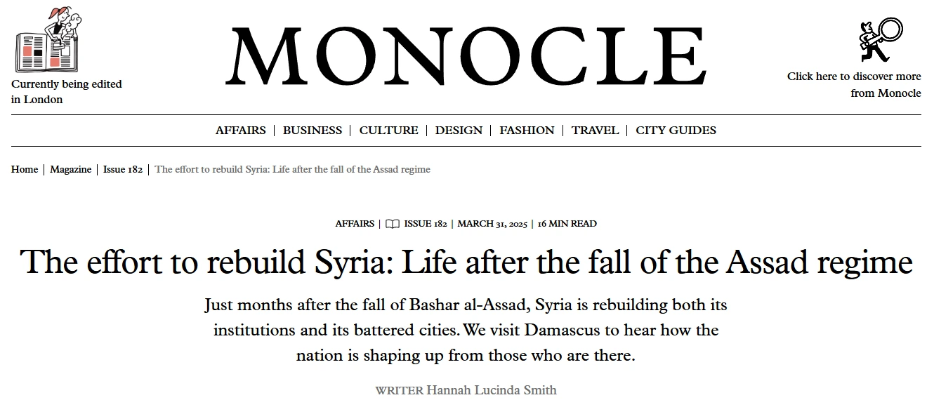 في تقريرها الأخير بعنوان “جهود إعادة إعمار سوريا”، تناولت مجلة Monocle العالمية المتخصصة بالشؤون الدولية، معرض بيلدكس كمنصة رئيسية في مشهد إعادة الإعمار ما بعد النزاع في سوريا. وأشار التقرير إلى كيف أصبح بيلدكس مركزاً حيوياً للشركات الدولية الراغبة في المساهمة في إعادة بناء البنية التحتية والاقتصاد السوري.